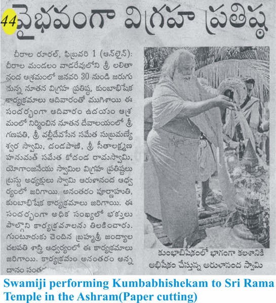 - Inauguration of Sri Rama Temple in Lalitananda Ashram, Vadarevu, Reported in Vaarta, Feb. 1st, 2006.