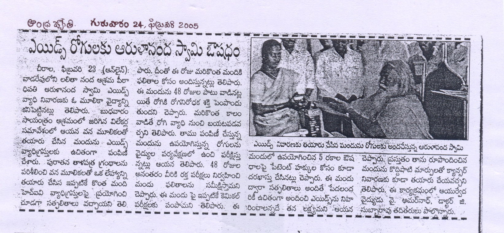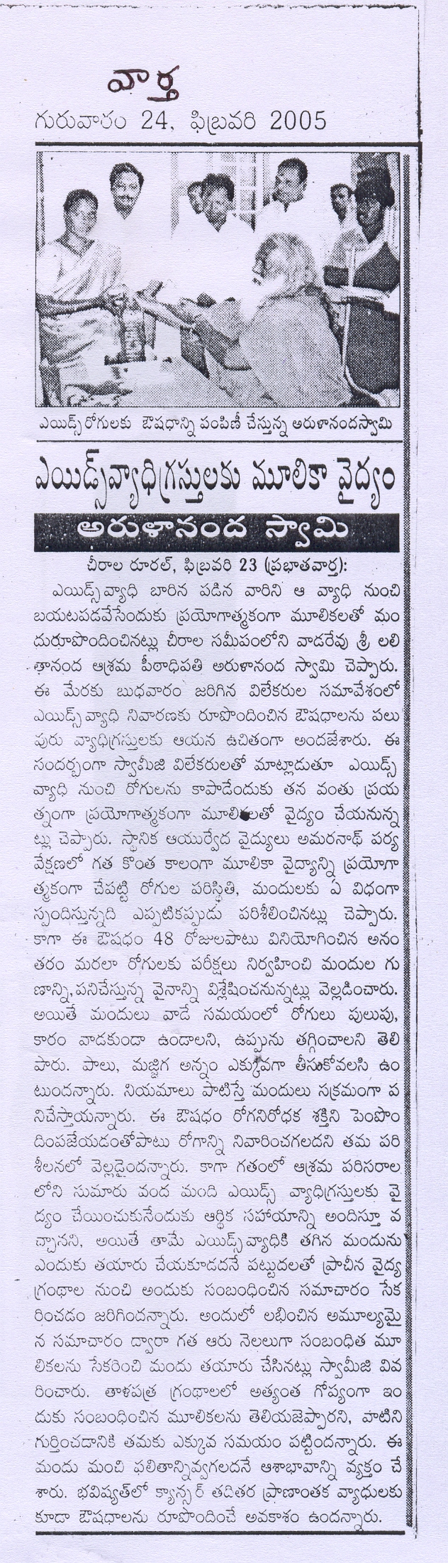 - Swami Arulananda prepares a siddha medicine for AIDS patients and starts clinical trials. After the determining the efficacy of the medicine, it will be distributed for free for poor people. News in telugu newspapers available at Andhra Jyoti and Vaarta, Feb. 24th, 2005.