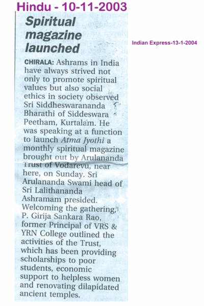 - Spiritual Magazine Atmajyothi launched by Sri Siddheswarananda Bharathi of Siddeswara Peetham, Kurtalam, Indian Express, Nov. 10th, 2003.